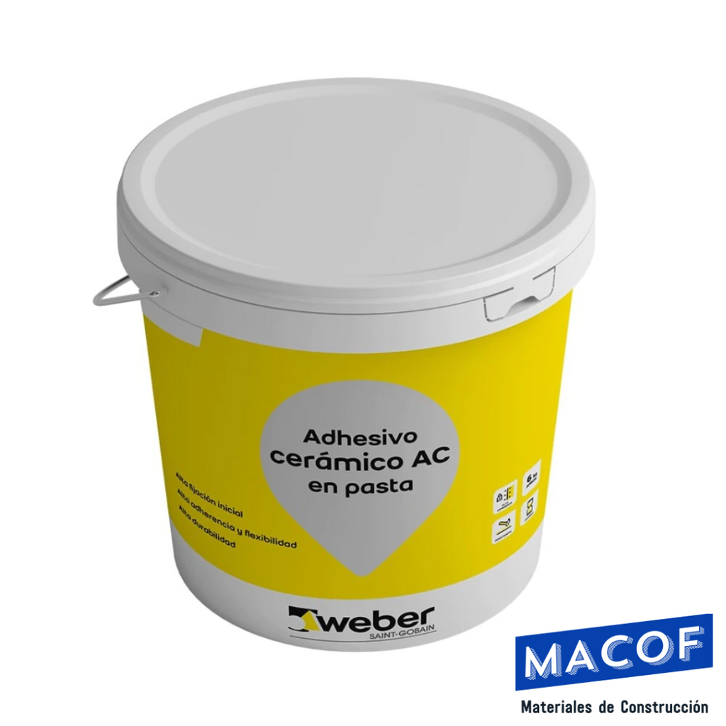 Pegamento AC en pasta lista para el pegado de piedra, porcelanato, gres porcelánico, cerámica y azulejos de hasta 45x45 sobre muros rígidos y tabiques en interiores.